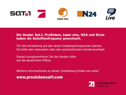 | 01/08/07: infocard from ProSiebenSat.1, from Germany on Astra, 19°.2 east 12480 V 27500 3/4 id: ProSieben_alt provider: ProSiebenSat.1 framesize: 720 x 576 |