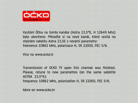 | 28/12/07: infocard from czech music channel Ōĉko TV on Astra 3A, 23°.5 east 12649 H 5600 5/6 id: OCKO-TV framesize: 544 x 576 The channel has moved to a new frequency on Astra 1E, co-located at 23°.5 east: 10862 H 22000 5/6 id: Ocko TV provider: OCKO TV network: ASTRA 23.5 (Sat=1E) framesize: 544 x 576 |