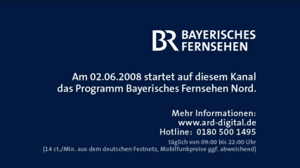 | 19/03/08: infocard from Bayerisches Fernsehen Nord on Astra 1, 19°.2 east 11836 H 27500 3/4 id: Bayerisches FS Nord provider: ARD framesize: 720 x 576 |