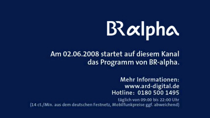 | 19/03/08: infocard from BR-alpha on Astra 1, 19°.2 east 12266 H 27500 3/4 id: BR-alpha provider: ARD framesize: 720 x 576 |