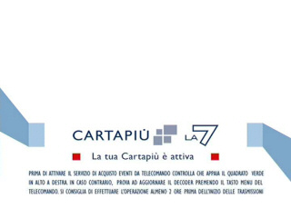 08/03/08: infocard from La7 Cartapił on Atlantic Bird 1, 12°.5 west 12515 H 17455 3/4 id: LA7Cartapiu' attivazione provider: MBone framesize: 720 x 576 |