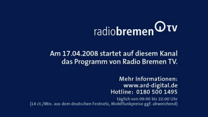 | 21/03/08: infocard from Radio Bremen TV on Astra 1, 19°.2 east 12422 H 27500 3/4 id: Radio Bremen TV provider: ARD framesize: 720 x 576 |